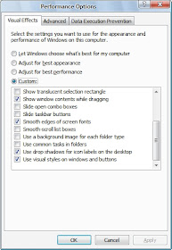 Visual Effects tab ထဲက မလိုအပ္တာေတြ Disable လုပ္ပစ္မွာျဖစ္ပါတယ္။ Custom ကိုႏွိပ္ၿပီး ေအာက္က ငါးခု ထားခဲ႔ပါ။ က်န္တာ disable ေပးလိုက္ပါ။