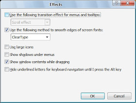 ၂။ Desktop ေပၚမွာ Right-click လုပ္ၿပီး Properties ကို ႏွိပ္ေပးပါ။ ၿပီးရင္ Appearance tab ထဲက Effects uncheck လုပ္ေပးပါ။ (uncheck လုပ္ရမွာေတြကို အနီနဲ႔ျပၿပီး check လုပ္ရမွာေတြကို အျပာနဲ႔ျပပါ႔မယ္)